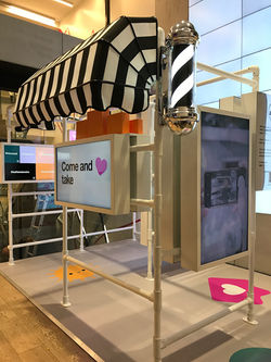 The first was at the end of the first lockdown and the main aim was to support local businesses. Each side of the installation was individually branded to champion a different small business along with featuring something relevant to their services. We custom built a wide range of elements including a bespoke nail varnish and greeting card display unit, a café style awning and a spinning barber shop pole.